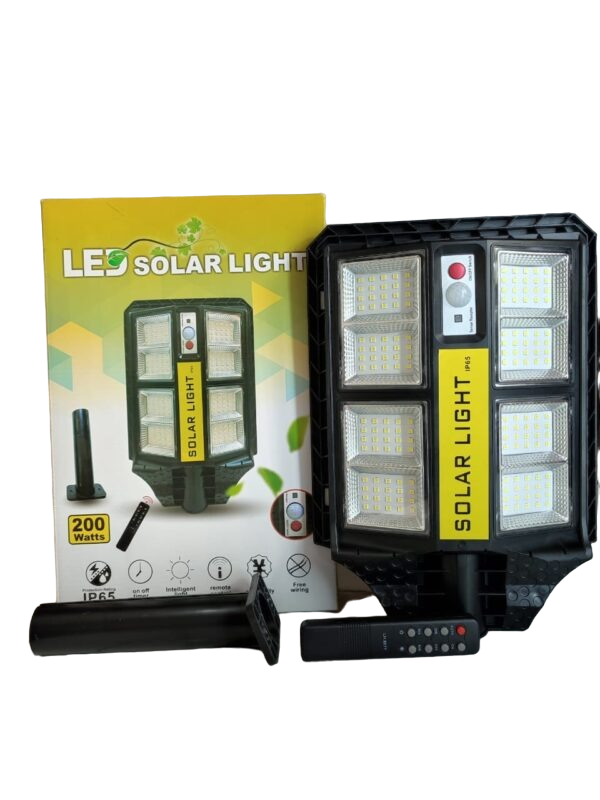 200W Rain proof/ water proof Solar street lamp with light sensor, enabling it to auto switch on at Night and aito off during the day. Which is also remote controlled.